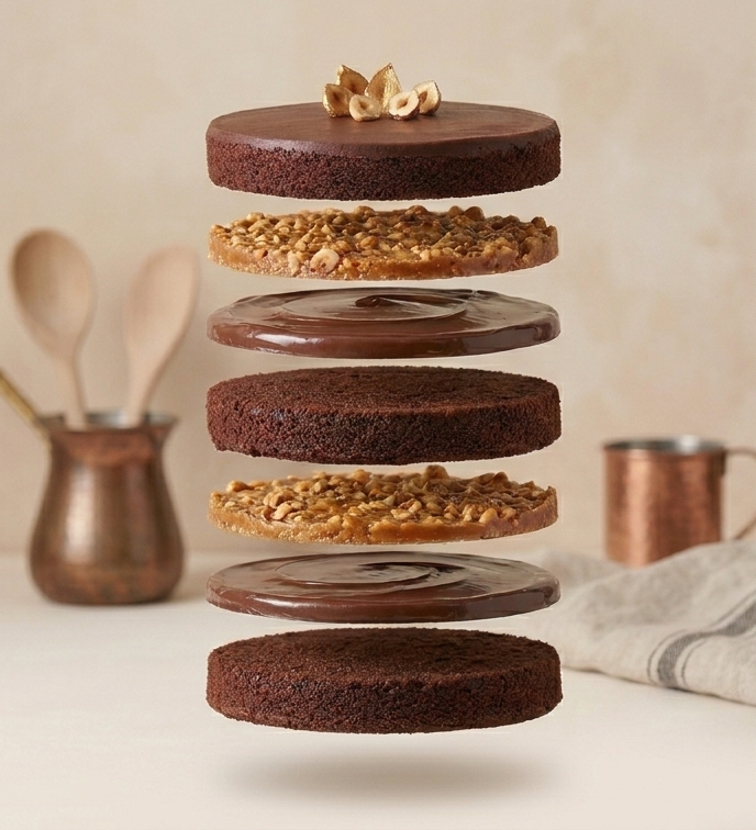 Deep chocolate sponge, glossy ganache, and crunchy hazelnut praline come together in perfect harmony.